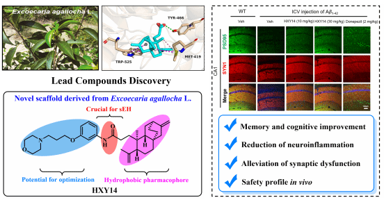 本项研究中,研究团队基于对海洋天然产物的活性筛选,以构效关系研究及CADD为指导,合理设计并发现了一种新型二萜类sEH抑制剂HXY14,并通过CETSA实验证实其与sEH的结合。在神经炎症细胞模型中,HXY14可减轻神经炎症并伴随神经保护作用。在AD小鼠模型中,HXY14能够改善记忆与认知功能障碍,且表现出良好的体内安全性。进一步发现,HXY14处理可显著降低炎症因子表达水平并减弱小胶质细胞活化,从而抑制神经炎症。本研究拓展了天然来源sEH抑制剂的新发现,并为sEH抑制剂用于AD治疗提供了证据支持。