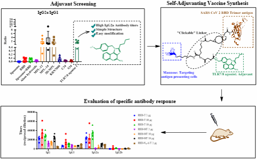 在《International Immunopharmacology》发表的研究则进一步探讨了新型三组分自佐剂疫苗的合成与免疫活性。研究团队对六种新型佐剂的活性进行了比较,筛选出优势佐剂TLR7/8激动剂,并首次将TLR7/8激动剂、甘露糖和新冠RBD蛋白共价偶联。动物实验结果表明,这种共价连接的疫苗显著增强了免疫反应。该研究为疫苗佐剂选择及活性增强提供了重要理论基础,并进一步推进了疫苗中佐剂的发展。
