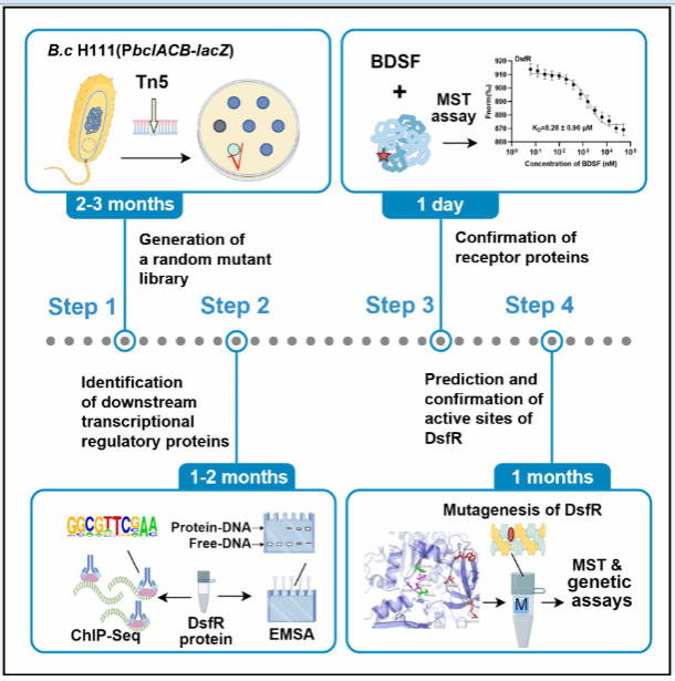 微生物通过细胞与细胞间信号交流,以促进它们适应不断变化的环境条件,这种细胞-细胞相互交流的机制被称为群体感应(Quorum sensing,QS),群体感应被广泛应用于病原菌调节生物学功能和致病毒力。洋葱伯克霍尔德菌(Bcc)是医院中一类重要的条件致病细菌,通常感染囊型肺纤维化(Cystic Fibrosis,CF)患者等免疫力低下的人群,其感染后常造成患者肺功能衰竭并伴有败血症,引起的临床症状被称为“洋葱伯克氏综合症”。洋葱伯克霍尔德菌主要通过以BDSF为信号分子的群体感应系统调控生物膜形成、运动性等表型和致病性。因此,鉴定新型病原细菌群体感应信号受体并解析其调控机制,对于阐明病原细菌的致病机制并开发新型抗菌药物起到重要推动作用。