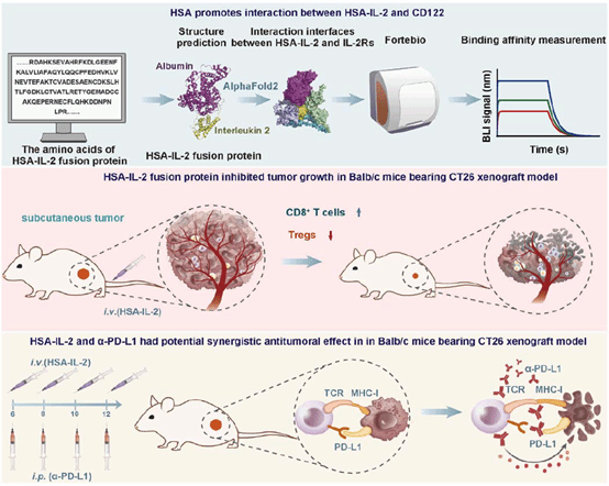 IL-2作为十分重要的一类细胞免疫调节因子,在肿瘤治疗中发挥着关键性作用。然而,因其较短的半衰期以及系统性免疫副反应使其临床应用受到限制。研究团队利用白蛋白作为药物递送载体,构建了一种HSA-IL-2融合蛋白,能够有效提高IL-2在体内的循环时间。同时,通过AlphaFold2蛋白质结构预测以及ForteBio亲和力测定等手段,发现HSA结构域能够促进HSA-IL-2融合蛋白与CD122之间的蛋白相互作用。
