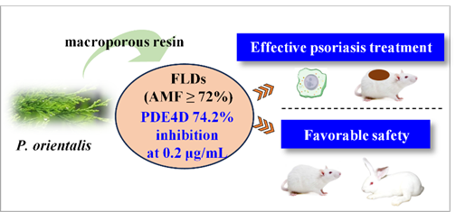 本研究从自建的1000余种药用植物库进行PDE4抑制剂的高通量筛选,发现侧柏提取物的抑制活性突出,进一步提取分离确认主要活性成分为穗花杉双黄酮(Amentoflavone)。随后,团队采用大孔树脂分离技术,富集了穗花杉双黄酮含量超过70%的黄酮有效部位:在体外实验中可显著降低银屑病模型细胞的增殖和炎症因子释放,在体内实验中则几乎逆转银屑病小鼠的病理表现,在新西兰兔上进行的亚急毒评价中也未发现任何毒副作用,具有良好的开发前景。