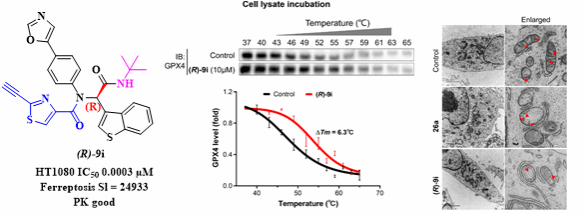 该联合团队以前期发现的新型GPX4抑制剂26a(JMC. 2021)为先导物,进一步对其进行亲电片段筛选和合理结构修饰,获得了一种新型GPX4抑制剂(R)-9i,对于多种肿瘤细胞具有显著的细胞毒性 (HT1080的IC50 = 0.0003μM,HepG2的IC50 = 0.056μM等),并表现出显著的铁死亡选择性(selectivity index = 24933)。相较于先导化合物26a具有更好的药代动力学性质,在体内药效学实验中显示了良好的抗恶性肿瘤的效果及安全性。这项研究不仅提供了高选择性小分子铁死亡诱导剂(R)-9i,也为GPX4抑制剂的合理设计提供了重要的参考。