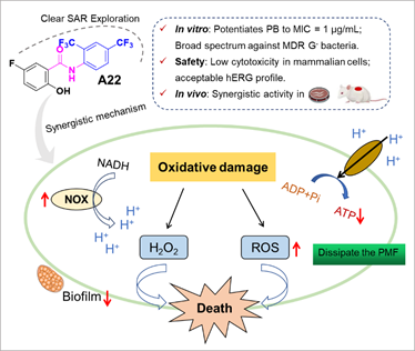 本研究通过结构优化,成功开发出高效、安全的PB协同增效剂A22,并通过体内外实验全面验证了其卓越的抗菌活性和安全性,同时揭示了其增敏机制,为抗生素增敏剂的开发提供了新的思路。