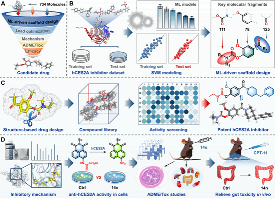伊立替康(Irinotecan)是一种广泛用于治疗多种实体瘤和转移性癌症的前药,但其在肠道中代谢生成的高毒性代谢物SN-38常导致严重的迟发性腹泻和肠道炎症,显著增加了患者的治疗成本和痛苦。近年来,针对伊立替康诱导的肠道毒性(ITGT)的治疗研究聚焦于抑制肠道羧酸酯酶2A(hCES2A)的活性,以减少SN-38的生成,从而缓解肠道毒性。然而,目前临床上用于缓解ITGT的药物效果有限且存在副作用,因此开发高效、特异性强的hCES2A抑制剂具有重要的临床意义。