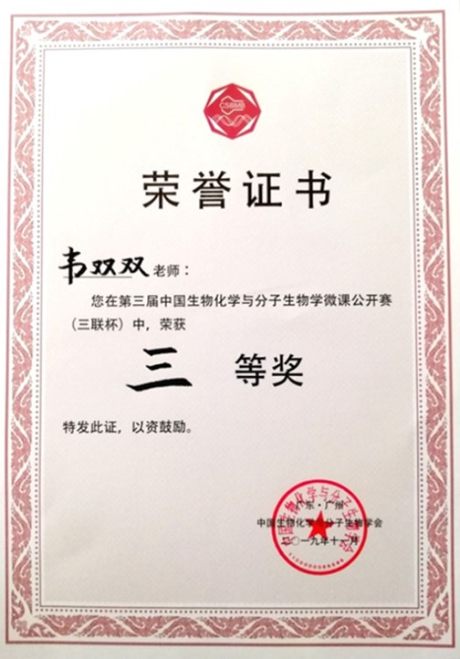 生物化学与分子生物学是生命科学和生物医学等学科的核心专业。为促进教学理念、思路、设计和方法的创新实践与交流,提高各高等院校的专业教学水平,中国生物化学与分子生物学会教学专业分会于2019年11月22-25日在广东广州举办“第三届中国生物化学与分子生物学微课公开赛(三联杯)暨第二届优秀教师训练营”。各省级生物化学与分子生物学会推荐1名教师参加竞赛,经过一天的激烈角逐,我院韦双双老师获得此次大赛三等奖。