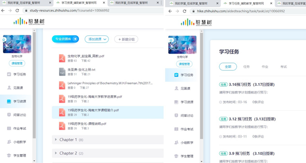 《生物化学》(海南联盟)为张老师参与主讲的一门海南高校精品在线开放课程。主讲教师均在教学一线长期讲授该课程,具有丰富的教学经验。课程设计合理,教学资源丰富,教学内容与本课程教学大纲要求相近,选择作为本课程的主要教学视频资源。但由于药学专业《生物化学》较《普通生物化学》有一定侧重点,另选择智慧树平台精品课程《生物化学》(天津中医药大学)作为辅助学习视频资源。张老师还创建了智慧树翻转课堂,克服共享课程教师无法上传相关教学资料的限制,在其中上传了本人的教学大纲,课程说明,教学计划,教学ppt,中文及英文版电子教材,相关视频等,供学生下载学习。