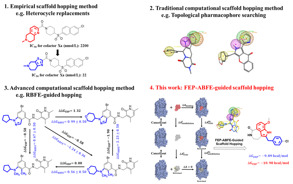 新骨架先导结构的发现是创新药物研究中非常重要的一环。目前,天然产物、高通量筛选、虚拟筛选、组合化学等为创新药物研究提供了丰富多样的化合物样本库,但不足以满足特定靶标对化学结构的精细需求。为此,yl9193永利官网靶向药物设计与发现团队利用自主发展的基于自由能微绕(FEP,Free Energy Perturbation)的药物设计方法并结合药物设计基本理论,成功发展了一种基于自由能微扰的“骨架跃迁”新方法。该方法具有较高的成功率,可为新骨架先导结构的发现提供理论指导与技术支撑。