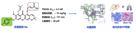 特发性肺纤维化(IPF)是一种病因不明的纤维化间质性肺病,目前尚无理想治疗药物。部分新冠病毒肺炎患者呈现较为严重的肺纤维化现象。磷酸二酯酶四型(PDE4)在纤维化的肺部组织中高度表达,是一个潜在的抗肺纤维化新靶标,但其抑制剂如上市药物罗氟司特等却因易引起严重的呕吐、腹泻等副作用而限制了其临床应用。因此如何发现高效低毒的PDE4抑制剂作为新型抗肺纤维化候选药物具有重要的意义。
