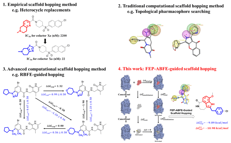 为此,研究团队利用自主发展的基于自由能微绕(Free Energy Perturbation)药物设计新方法,发展“骨架跃迁”关键新技术。该方法具有较高的成功率,明显提高靶标对新骨架结合能力预测,获得高活性新骨架结构,从而提高先导结构的发现和优化效率,推动创新药物研发从先导结构向候选药物的转化(图1)。