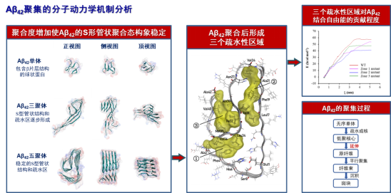 阿尔茨海默病(老年痴呆)是严重的智力致残性疾病,也是十大死因中唯一无法治愈或预防的疾病;患者平均生存期为5.5年。由42个氨基酸构成的β-淀粉样蛋白(Aβ42)脑内沉积是阿尔茨海默病的病理标志。Aβ42在脑内聚集引起细胞坏死和凋亡,损伤脑组织。Aβ42的聚集原理尚不清楚,了解其原理将有助于研发防治阿尔茨海默病的新药。yl9193永利官网,9193官网王大勇教授负责的生物技术制药与分子药理学团队,采用分子动力学研究方法,发现Aβ42单体是由β片层构成的球状蛋白,随着聚合度增加,在水溶液中形成最低自由能状态的S型管状结构,并产生三个疏水区;这三个疏水区在不同程度上影响聚合态Aβ42多肽链之间的结合自由能。针对以上三个疏水区,利用自主构建的包含300多万个二至五肽化合物结构的数据库,采用“分子对接-分子动力学-分子药理学”研究方法,筛选出可以抑制Aβ42聚集,降低Aβ42细胞毒性的多种短肽类化合物,并深入分析了精氨酸二肽、以及若干三肽和五肽的药理作用,为研发防治阿尔茨海默病的新药和保健食品提供理论基础和实验依据。部分研究内容近期发表在生物学Top期刊——International Journal of Molecular Sciences. 2023, 24(8):7673。