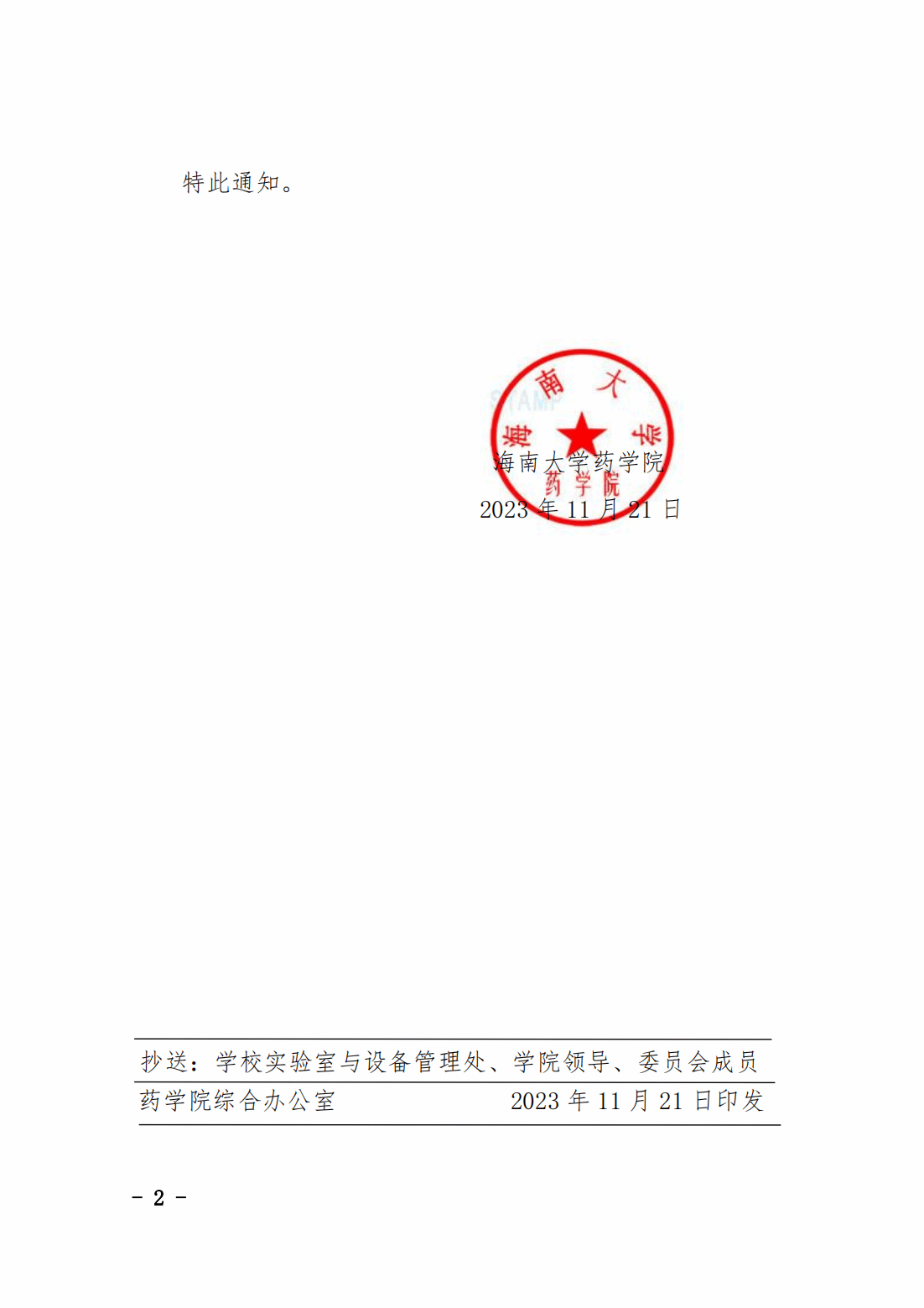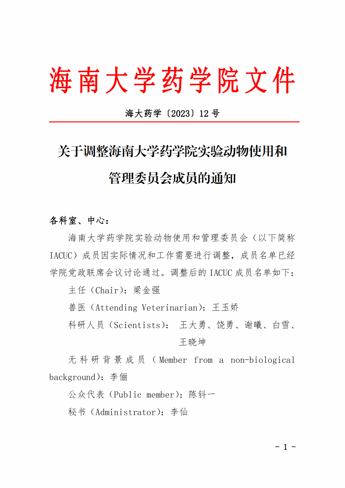 海大药学〔2023〕12号:关于调整yl9193永利官网,9193官网实验室动物使用和管理委员会成员的通知.pdf